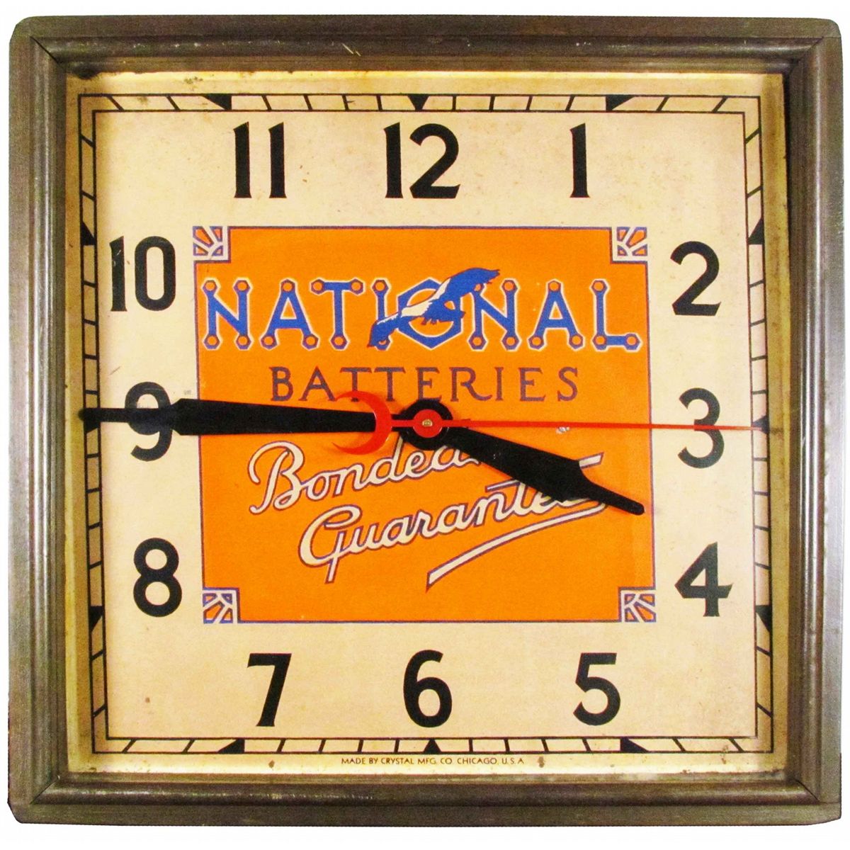 National Batteries Clock. Made by the Crystal Mfg. Co. Chicago, USA. Excellent working condition. 15 1/2 inches square X 3 1/2 inches deep.