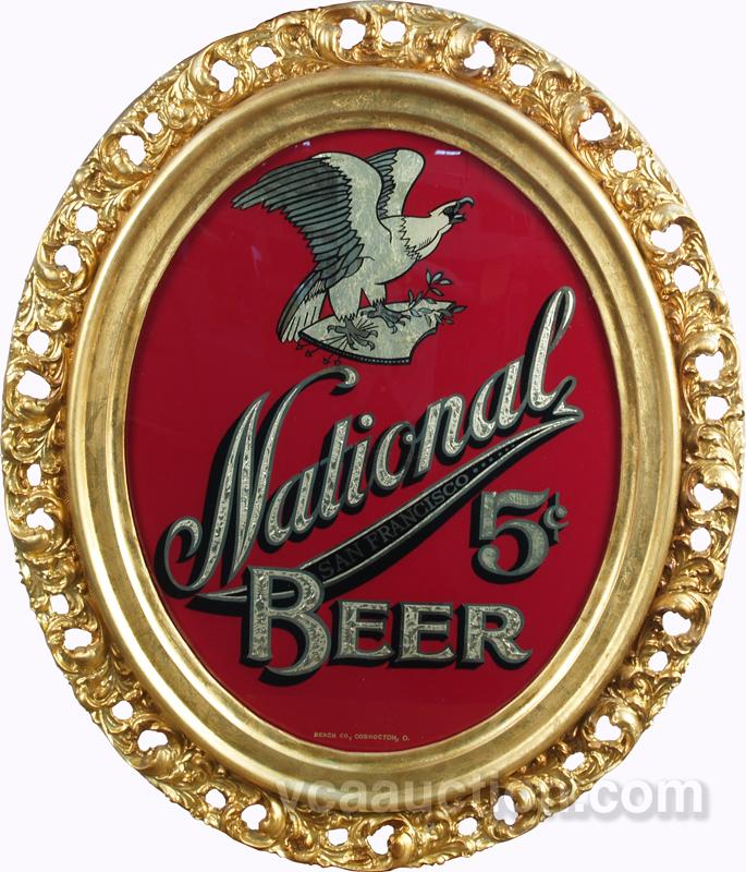 National Beer, San Francisco Oval Reverse Glass Sign MFG By Beach Co. Coshocton, O. In Ornate Wood Gold Painted Frame, All Original (One Of A Kind) - 22" x 27"