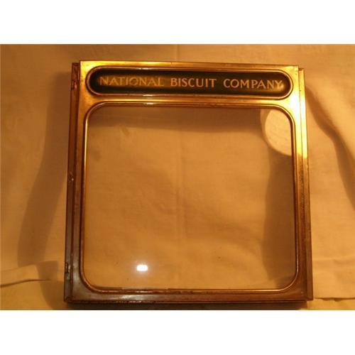 Antique Advertising Store display lid for biscuit boxes. Excellent condition. Original glass and advertising, brushed silver-gold finish on the tin but not as gold as the picture appears. Size: 10 1/2" square, 2" tall. Glass is 8 3/4" x 7 3/4", advertisement is 9" by 1 1/4". The lid is hinged. This lids are extremely hard to find. I have 4 and each one has slightly different advertising or something unique. These would be great to put over your own 10.5" box as a unique display. Marked property of National Biscuit Company patent applied for. This one has National Biscuit Company in the green and the top is open where it fits over the box