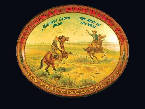 National Brewing Co. Tin Serving Tray, San Francisco, California, 1903, H. W. Hansen, artist, excellent condition, 16 1/2 x 13 1/2 inches.