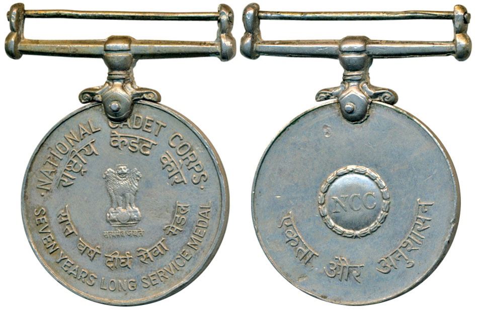 National Cadet Corps (NCC), 7 Years Long Service, Cupro-Nickel Medal, obv. Ashoka Pilllar in center, rev. monogram of the NCC in center, Ekta Aur Anushashan in Devanagri, awarded to J8240 Senior Officer P Singh. Extremely Fine, Rare.