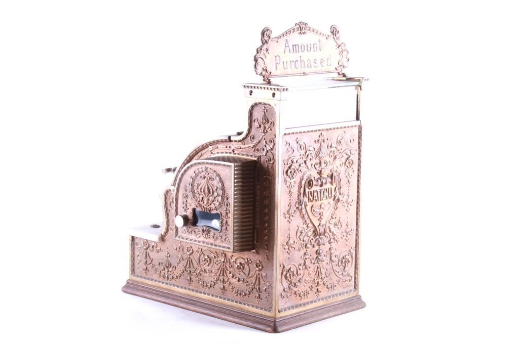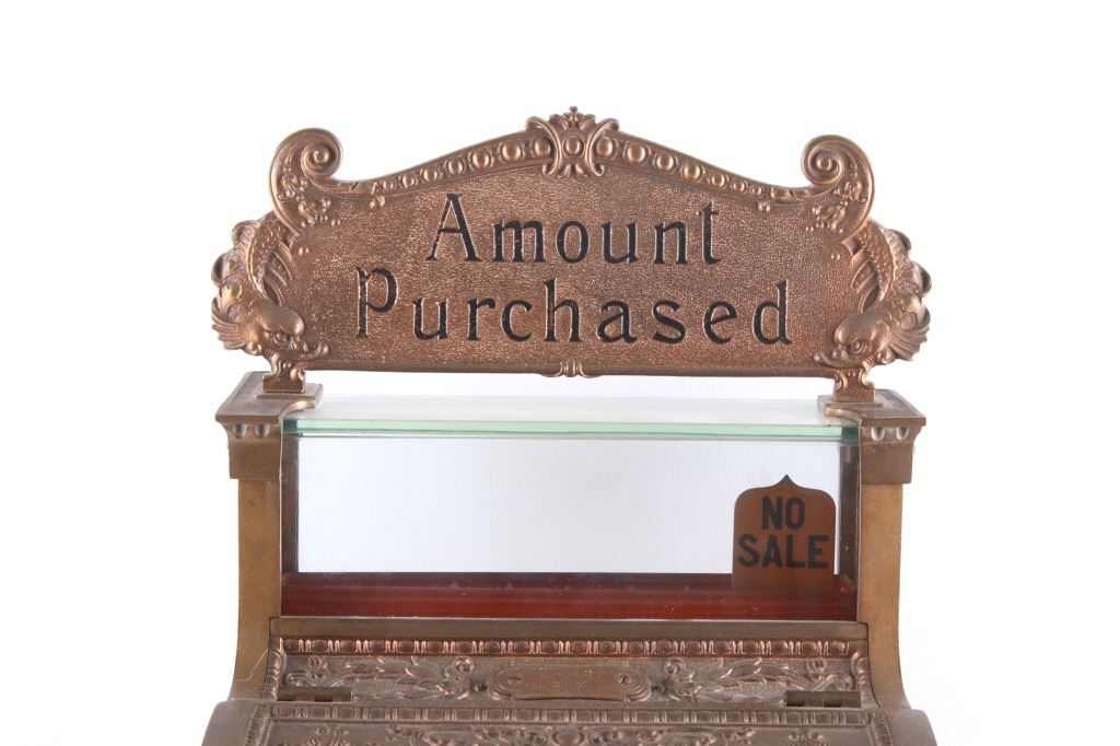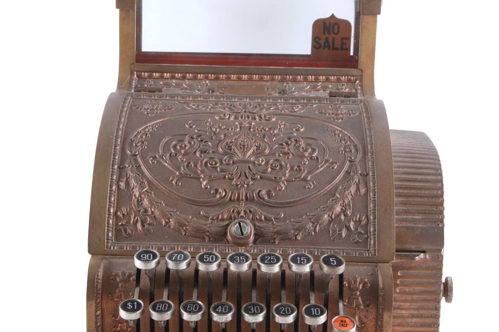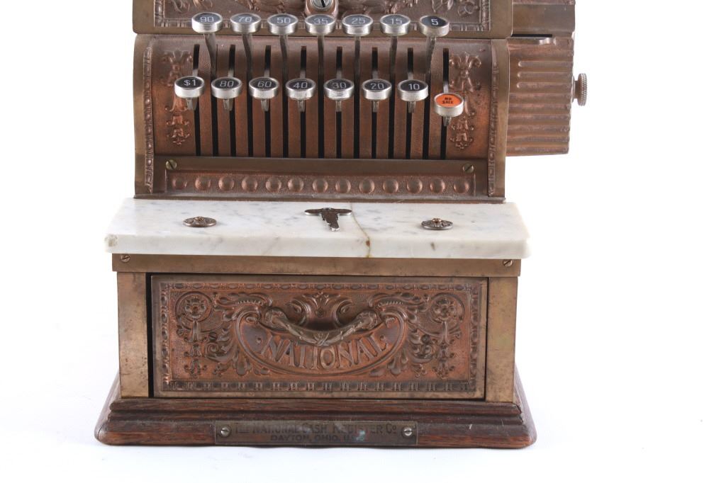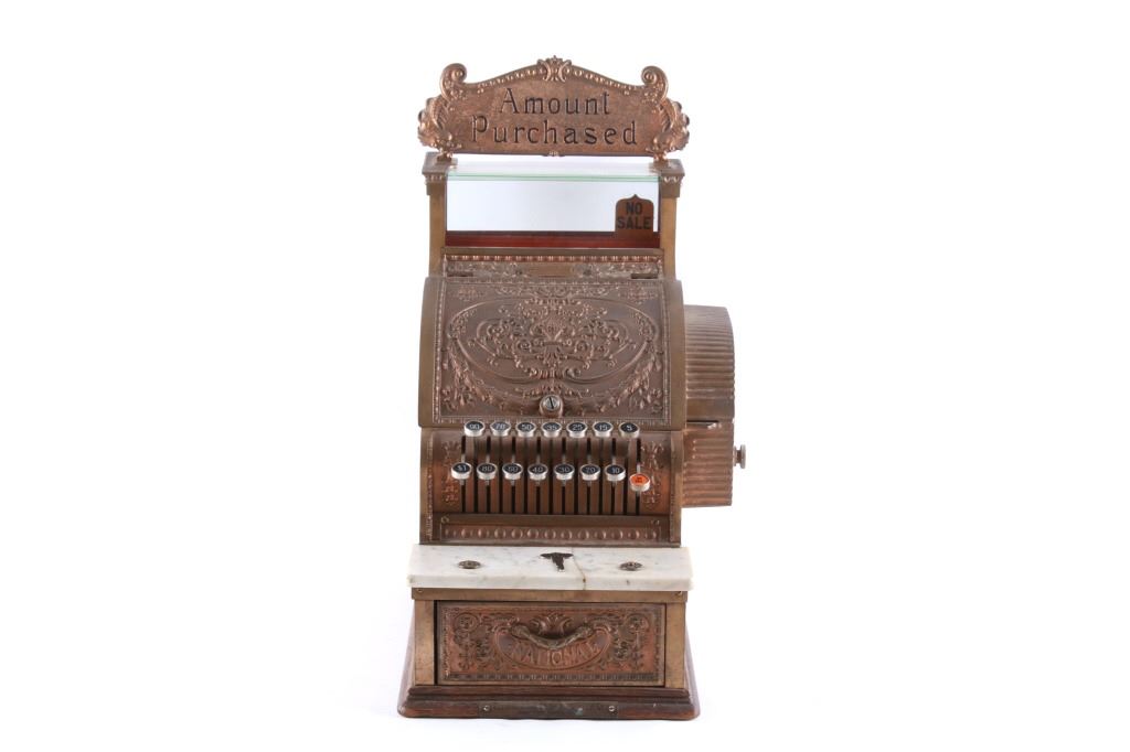 Featured in this lot is this National Cash Register Co. 317 series brass cash register out of Dayton, Ohio circa 1913. The pattern to the decoration of the register is considered a "Dolphin Pattern," as can be seen on the arch at the top of the register and shows consistent decoration to the side paneling and to the top flap of the register and along the the register drawer. The serial number displayed on the top of the register is Serial No. 1011151 and shows the model number underneath Model No. 317. The register is marked above the lock '1' and on the register drawer 'National'; at the bottom of the register tacked into the wood base is marked 'The National Cash Register Co. Dayton, Ohio. The register comes complete with a key for the register lock. The condition of this cash register is previously the keys worked but are stuck in the "No Sale" position, there is a crack in the marble plate under the keys but otherwise the register shows a great sheen to the brass and shows very little wear to the lettering of the pattern adorning the register. The measurements of this register is 20 3/4" x 16 1/8" x 10 1/4".