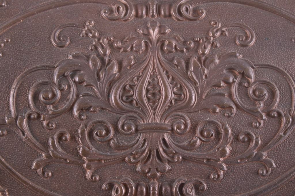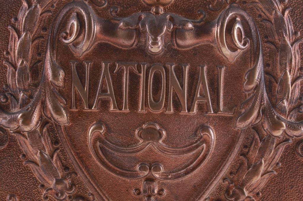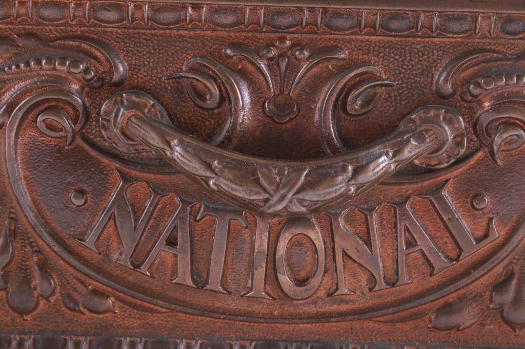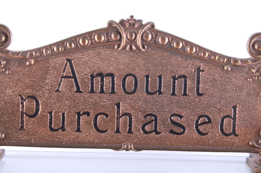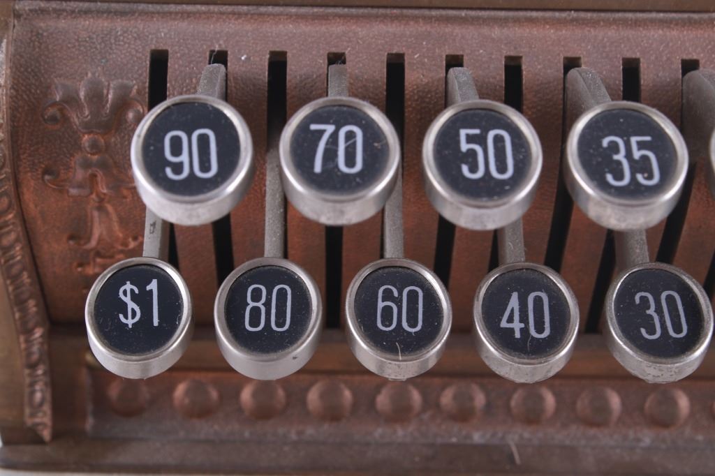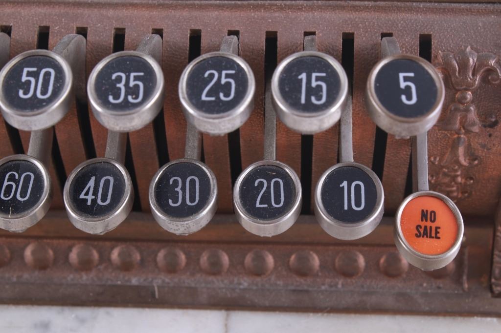 Featured in this lot is this National Cash Register Co. 317 series brass cash register out of Dayton, Ohio circa 1913. The pattern to the decoration of the register is considered a "Dolphin Pattern," as can be seen on the arch at the top of the register and shows consistent decoration to the side paneling and to the top flap of the register and along the the register drawer. The serial number displayed on the top of the register is Serial No. 1011151 and shows the model number underneath Model No. 317. The register is marked above the lock '1' and on the register drawer 'National'; at the bottom of the register tacked into the wood base is marked 'The National Cash Register Co. Dayton, Ohio. The register comes complete with a key for the register lock. The condition of this cash register is previously the keys worked but are stuck in the "No Sale" position, there is a crack in the marble plate under the keys but otherwise the register shows a great sheen to the brass and shows very little wear to the lettering of the pattern adorning the register. The measurements of this register is 20 3/4" x 16 1/8" x 10 1/4".