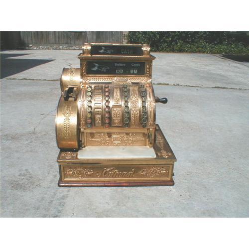 Here is a solid brass, NATIONAL, cash register in very good to excellent condition.  The surface of the register is still shiny bright.  The keys and drawer mechanisms all work properly. Every thing works on this register! It has ACCOUNT KEYS A thru K and will ring up to $9.99 of merchandise. The marble finger rest is original to the register. This register is a heavy 150 pounds and will require shipment by motor freight.