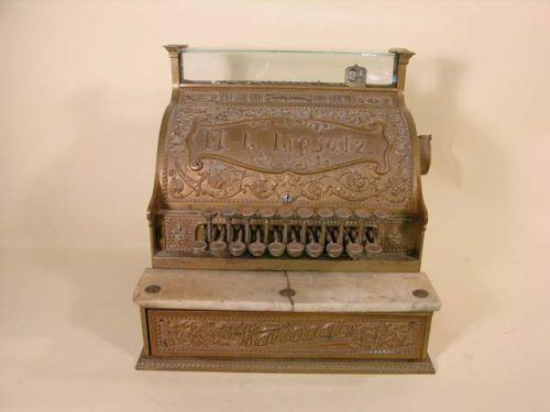 National cash register #7 with original clock mounted on side. Personalized door for M.L. Lipsutz. Marble tray cracked in center. Ex. cond.