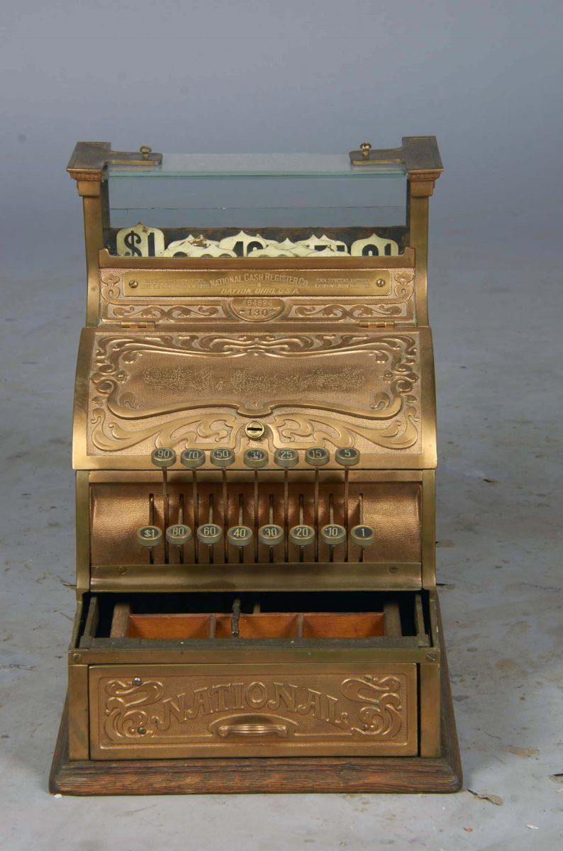 Serial No. 464894 circa 1905, Brass with Art Nouveau design, wood base, "National" drawer and blank space on front for name of owner/store. No marble shelf and back metal plate is not original. Working. Condition (Good). Size 11-1/2" x 14-1/2" x 15-1/4"