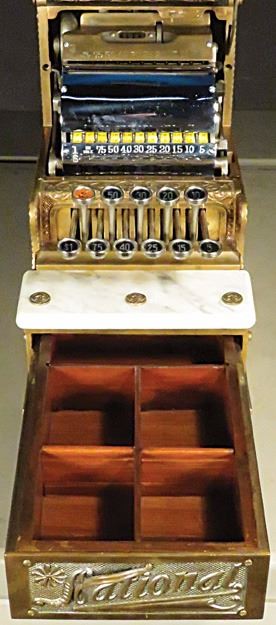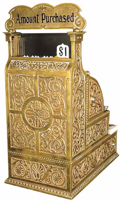 National Cash Register Co. Candy Store Model 5 Scroll. SN# 205387. All brass with marble shelf. Glass key checks with ornate till. Four holes with screws for breast plate. Older restoration, working condition.