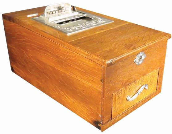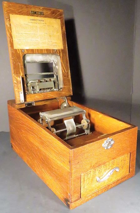 National Cash Register Autographic Register. Original direction on lid interior. Oak case with nickel trim. Excellent restored working condition. 10 1/4 X 10 X 18 1/2 inches.