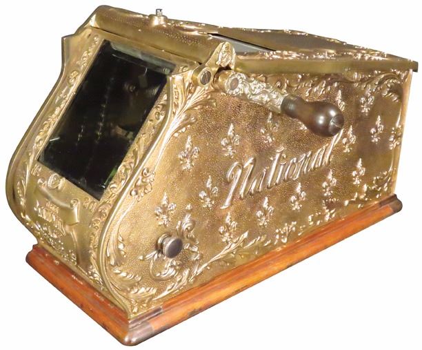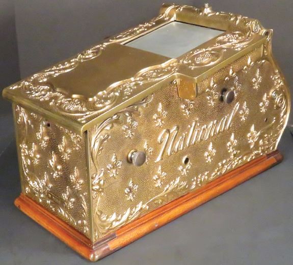 National Cash Register Co. Autographic Register. Seriel # 753563. Brass with beveled glass and wood base. 8 X 9 3/4 X 15 1/2 inches.