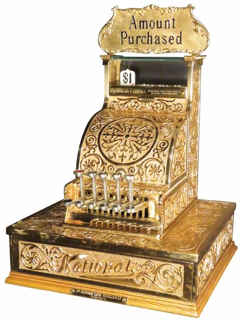 National Cash Register Co. Barber Shop Model 1. SN# 457179. All brass with extended base. Very rare canadian number 1. Glass key checks. One of the rarest extended base scroll machines. Canadian ones have curved key arms unlike any other scroll machines. Professionally restored conditon.