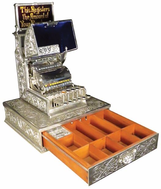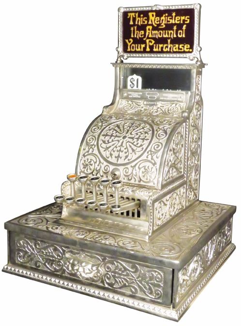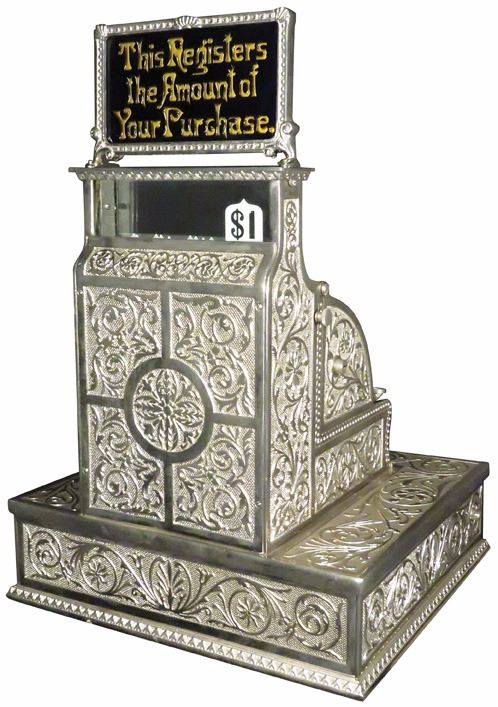 National Cash Register Co. Rare Barber Shop Model 6. SN# S38875. All nickle with extended base. Very early model 6 scroll with narrow indication and glass key checks patterson pull. Older restoration and a very nice machine. Reproduction top sign with glass insert "This register is the amount of your purchase". Excellent restored working condition.