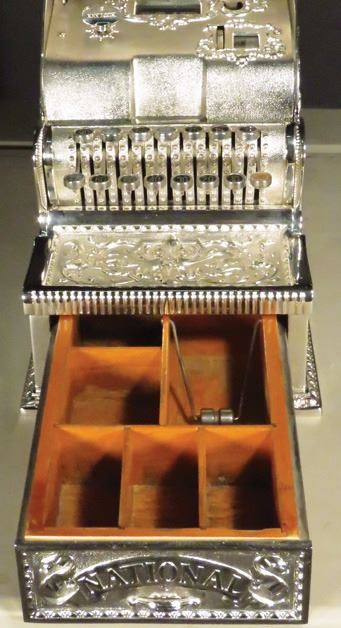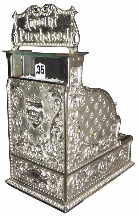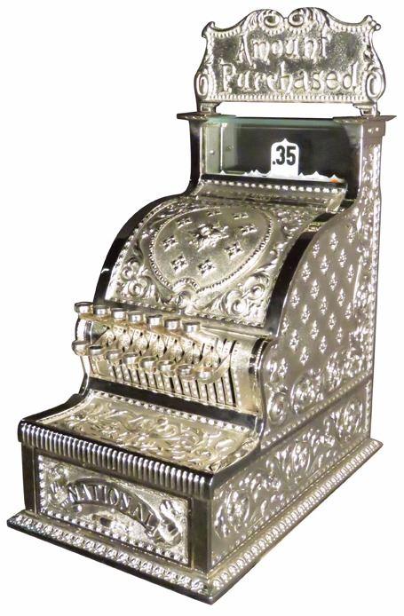 National Cash Register Co. Candy Store Model 50. SN# 156887. All nickel. Renaissance pattern machine with a rarely seen ornate till. Professionally restored by Dan Shelby. Reproduction top sign. Excellent working condition.