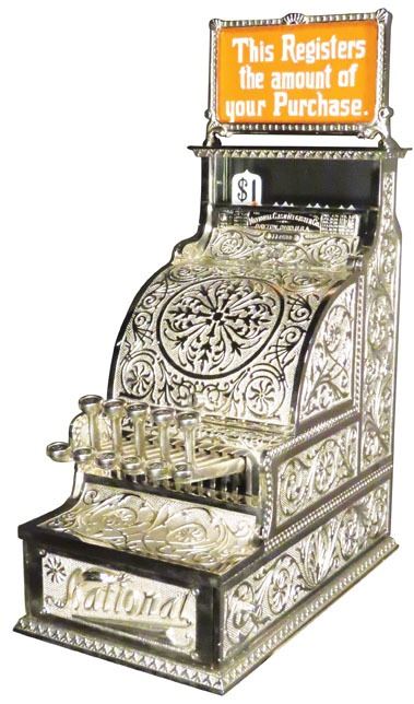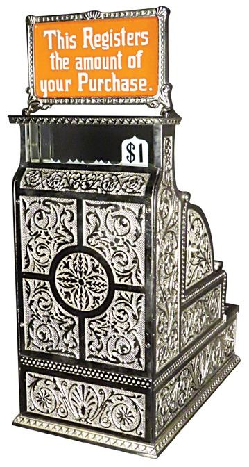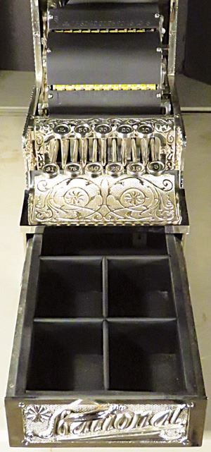 National Cash Register Co. Model 11. SN# 114638. All nickel. One of the rarest machines in the collection this model 11 is usually found in the ionic pattern. This machine is in the scroll pattern with a solid top and till. Brass key checks, solid top. The machine is made of cast iron just like the 11 in ionic patern. Restored dust cover blued just as an original. Drawer black as original. We have never seen another one like it. Very, very rare machine. The center of most advanced collections. Professionally restored working condition.