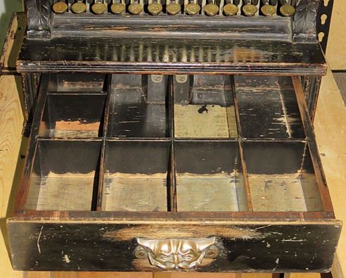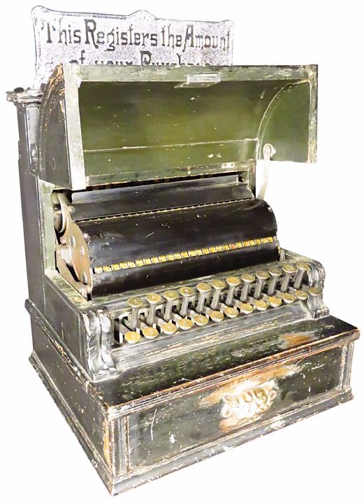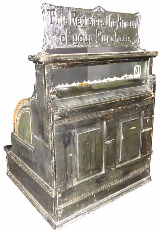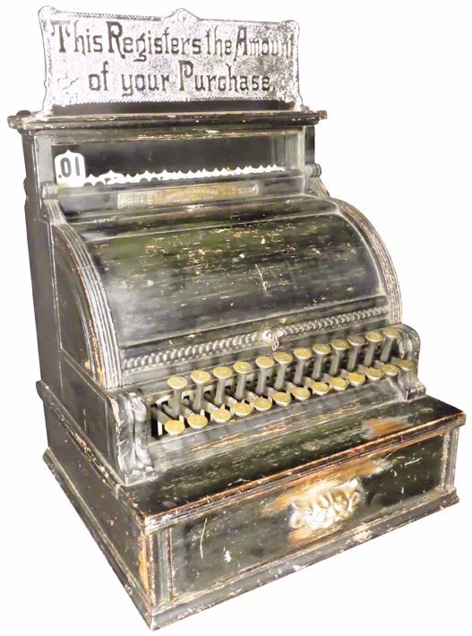 National Cash Register Co. Model 18, wood cash register. SN # 331374. A great survivor original factory painted black cabinet with brass key checks. Reproduction top sign. Machine has been cleaned and works perfectly. Comes with key.