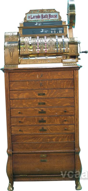National Cash Register Floor Model 553-E, 7 drawer quarter sawn oak cabinet w/ light-up top sign "The Loredo Bath House" w/ original 12" tape cage & N.C.R. coin & dollar bill cloth pouches w/ extra original spare tape rolls, restored, works great w/ all keys