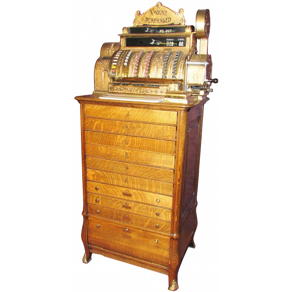 National Cash Register Floor Model Register. Ferris wheel counter, different tones for each drawer. 1912 Catalog and 13 keys included.