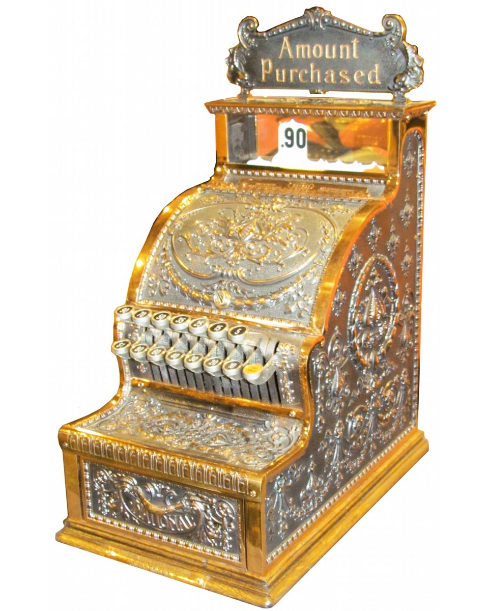 National Cash Register Model 311. Copper oxidized. Serial # 637631. Reproduction top sign. Professionally restored. Comes with keys.