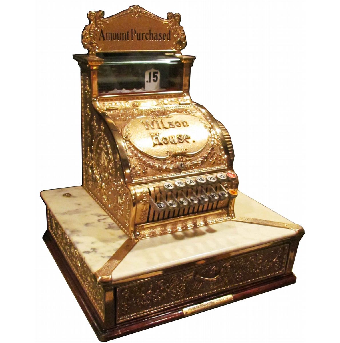 National Cash Register Model 327. Serial # 752562. Extended original marble 3 sided base, printer cover, original top sign and "Wilson House" breast plate. Professionally restored. Comes with keys.
