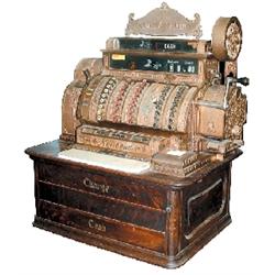 National Cash Register, Model 542-CR, oak 2 drwr. 9 clerk model, all original w/receipt writer, rings up to $99., 29"W x 34"H.