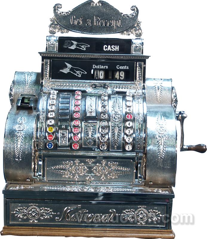 National Cash Register Model No. 442-E w/ "Get Receipt" top sign, nickel finish w/ 2 receipt cages, nicely restored