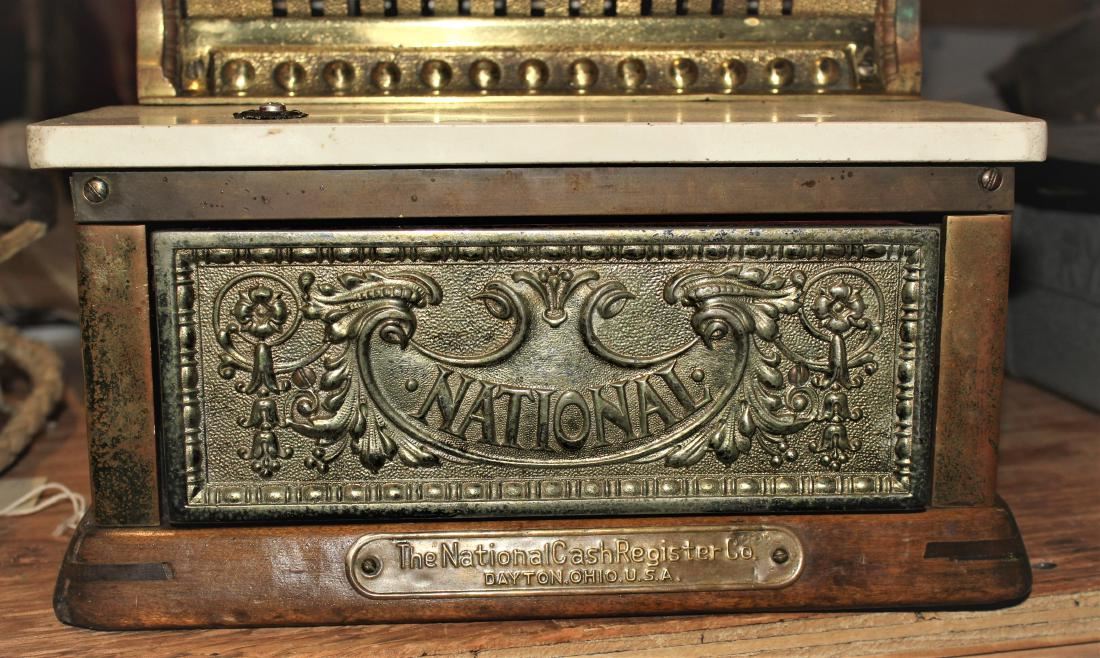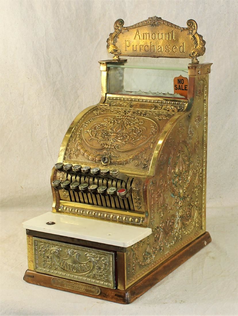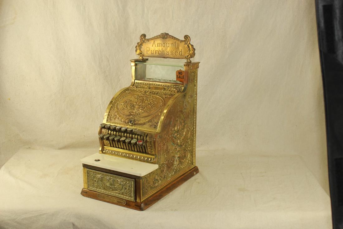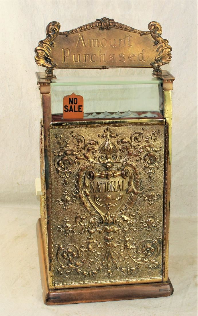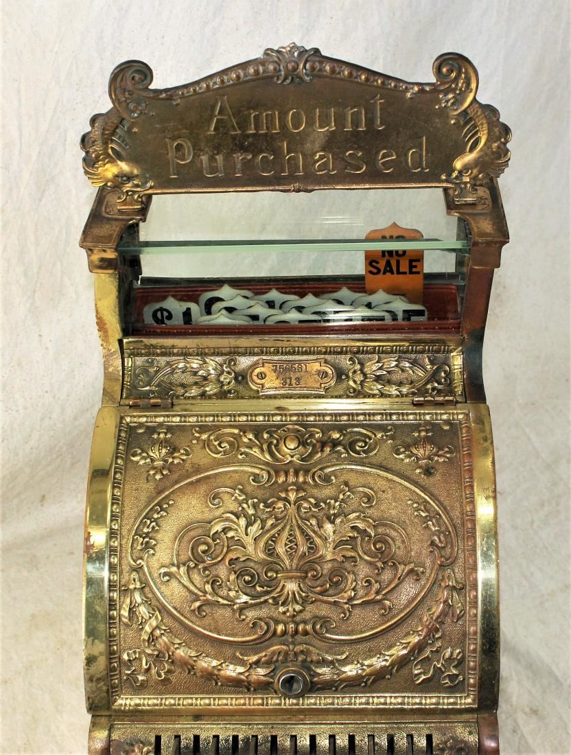Very desirable candy store style cash register with ornate designes and maker's name. Measuring 21"T x 9 1/2"W x 15"D.