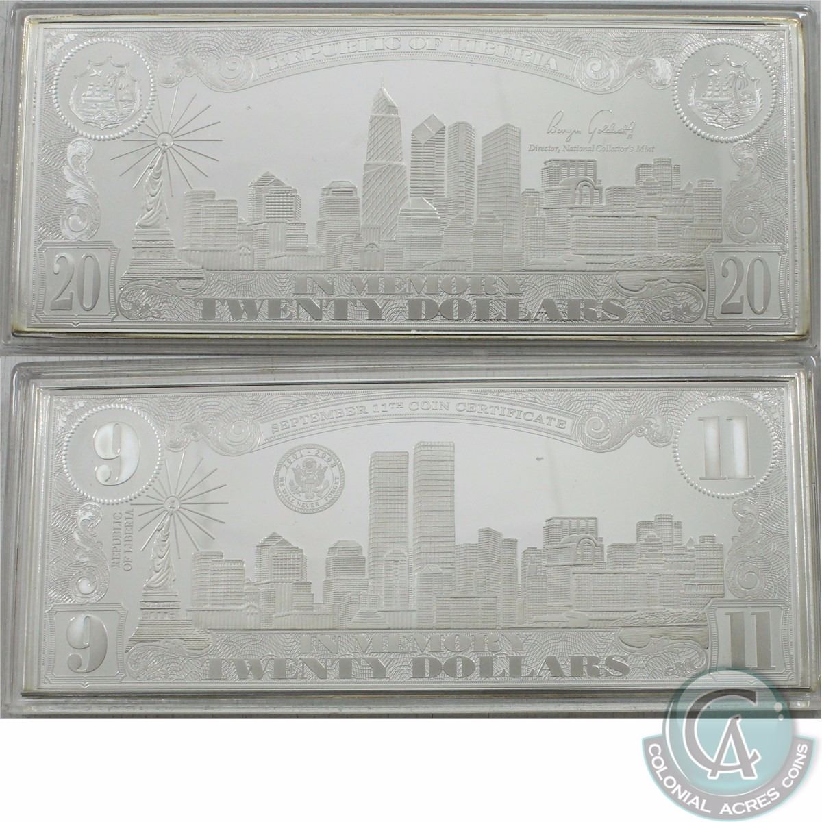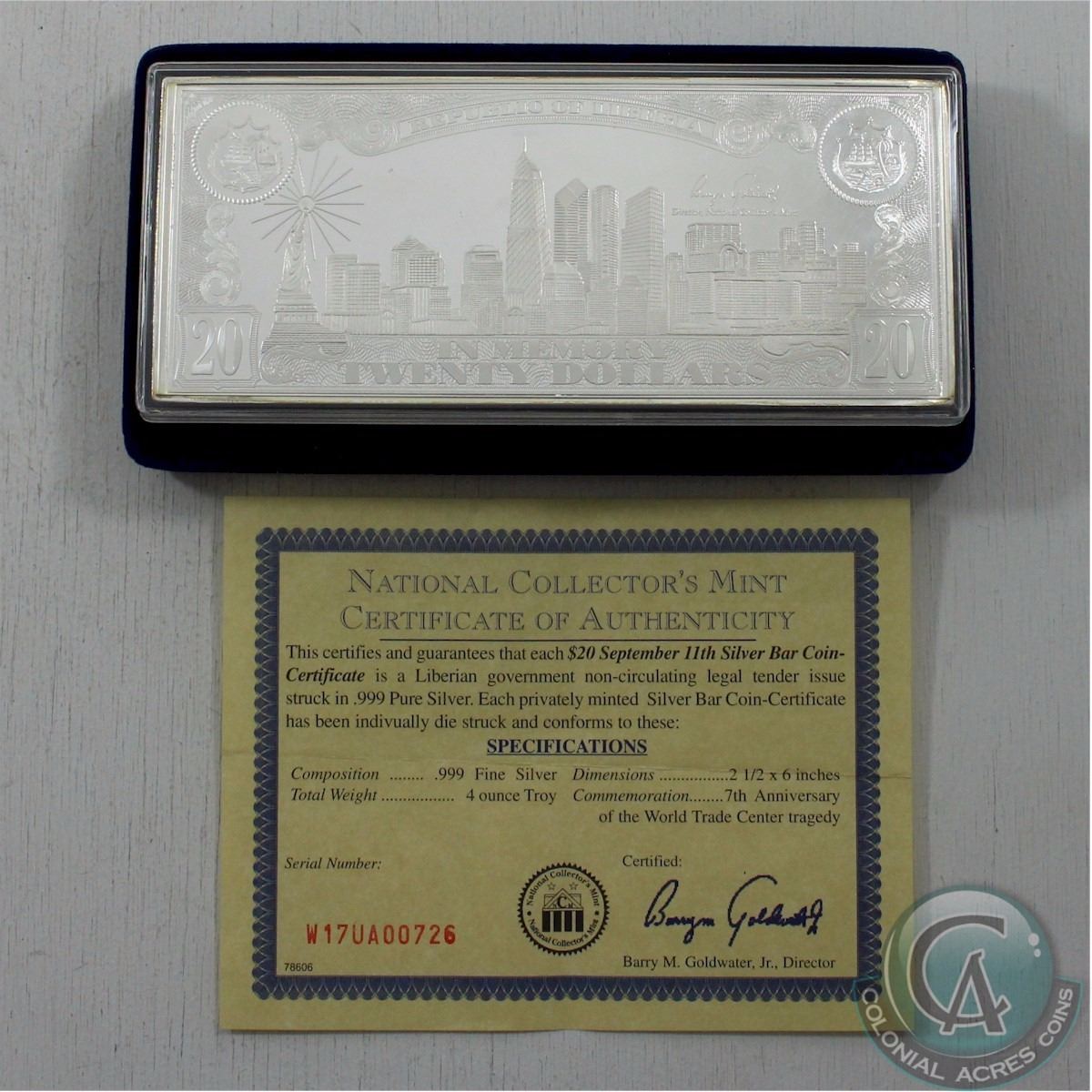 National Collectors Mint $20 September 11th .999 Fine Silver Bar struck by the Liberian Goverment. This bar contains 4 Troy oz of pure Silver to commemorate the 7th Anniversary of the World Trade Center tragedy and comes with Certificate of Authenicity (Tax Exempt)