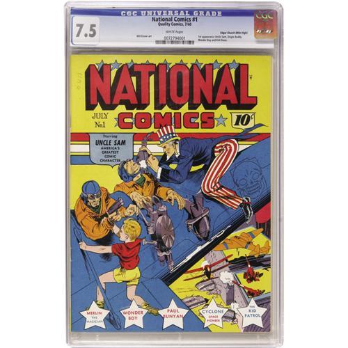 <B>National Comics #1 Mile High pedigree (Quality, 1940) CGC VF- 7.5 White pages.</B></I> A Lou Fine cover on a bright Mile High copy -- it doesn't get much better than that for the Golden Age collector! The superhero Uncle Sam made his first appearance here, as did his sidekick Buddy, probably the youngest sidekick ever, at least as drawn by Fine! Will Eisner handled the interior art. This is a beautiful book, notwithstanding the 7.5 grade, assigned because of a tough-to-see stain at one corner. We still don't know of a copy we'd rather own, nor has CGC certified a high-grade copy -- in fact, this is the only one graded above 6.0 as of this writing. Overstreet 2006 VF 8.0 value = $3,563. CGC census 3/07: 1 in 7.5, none higher.<BR><BR><b>Shipping:</b> Comics - Slabbed (certified) (<a target="_blank" href="http://www.heritageauctions.com/common/shipping.php">view shipping information</a>)