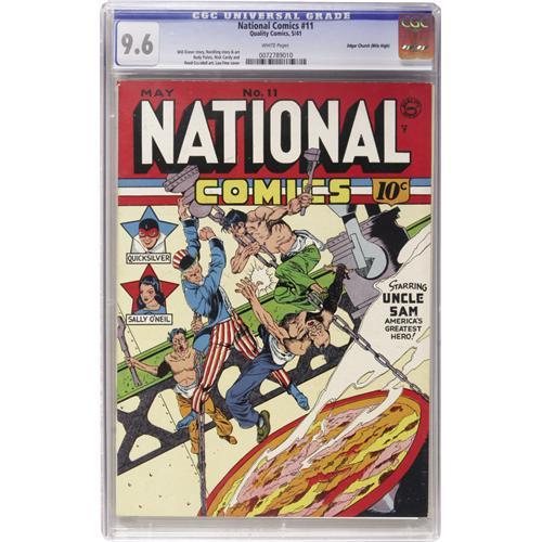 <B>National Comics #11 Mile High pedigree (Quality, 1941) CGC NM+ 9.6 White pages.</B></I> One look at this cover image will tell you why people love the artistry of Lou Fine! This is a beautiful copy with perfect page quality. Overstreet 2006 NM- 9.2 value = $1,725. CGC census 3/07: 1 in 9.6, none higher.<BR><BR><b>Shipping:</b> Comics - Slabbed (certified) (<a target=""_blank"" href=""http://www.heritageauctions.com/common/shipping.php"">view shipping information</a>)