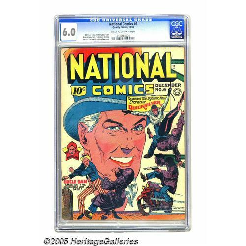 <B>National Comics #6 (Quality, 1940) CGC FN 6.0 Cream to off-white pages.</B></I> Uncle Sam and speedster Quicksilver are just two of the stars of this issue. It sports a Lou Fine cover and has interior art by the likes of Nick Cardy, George Tuska, and Dan Zolnerowich. Overstreet 2005 FN 6.0 value = $387. CGC census 7/05: 1 in 6.0, 1 higher. <I>From the Aviator Collection</B></I>. <BR><BR><B>Important notice:</B> Heritage usually auctions material at the rate of 200-250 lots per hour. On some occasions eBay Live bid software or the Internet may not be able to keep up with the pace of the auction. We recommend placing a realistic absentee bid now as insurance to avoid disappointment. Occasionally the auctioneer may eliminate or reject an eBay Live bid, and the auctioneer may also reopen a lot after the close of the eBay live bidding (usually because we missed an audience bid), and may reject your bid even if it shows you as the winning bidder. By bidding via eBay Live, you agree that Heritage may award the lot to another bidder at its sole discretion under the circumstances described above or any other reasonable circumstances. Since eBay bids are not shown to us until we open the lot on the floor, we treat those bids just like floor bids. In most cases the floor responds before the eBay bid is presented to us, due to Internet lag time, so for consistency we have made it a policy that floor bids are always considered first over tie eBay live bids. Also please note that all Heritage lots purchased through eBay Live carry a 20% Buyer's Premium. Please make sure you read the Terms and Conditions before you bid. This lot is being auctioned in conjunction with a live floor auction by Heritage Galleries & Auctioneers. All final auction and invoice information will be supplied by Heritage Galleries & Auctioneers, and all other information should be considered preliminary. Lot:3065 <BR><BR><B>Winning Notification and Billing:</B> After the FINAL session in this auction is c