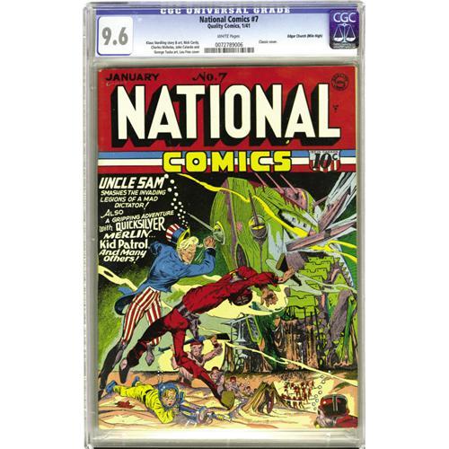 <B>National Comics #7 Mile High pedigree (Quality, 1941) CGC NM+ 9.6 White pages.</B></I> Any comic book from the Golden Age featuring a classic cover by artist Lou Fine is sure to grab lots of collector interest, but in this case that's only part of the story. Factor in this issues scarcity, the impeccable Mile High pedigree, and the incredible NM+ condition and you've got a truly incredible comic book! The glossy, vibrant cover colors, the spotless white interior pages, and the story art of such master artists as Klaus Nordling, Nick Cardy, John Celardo, Charles Nicholas, and George Tuska all amount to icing on the cake for this one-of-a-kind treasure. If you're serious about collecting comic books, and only the best will do, this is the one you've been waiting for! Overstreet 2006 NM- 9.2 value = $3,200. CGC census 5/06: 1 in 9.6, none higher. <BR><BR><B>Important notice:</B> Heritage usually auctions material at the rate of 200-250 lots per hour. On some occasions eBay Live bid software or the Internet may not be able to keep up with the pace of the auction. We recommend placing a realistic absentee bid now as insurance to avoid disappointment. Occasionally the auctioneer may eliminate or reject an eBay Live bid, and the auctioneer may also reopen a lot after the close of the eBay live bidding (usually because we missed an audience bid), and may reject your bid even if it shows you as the winning bidder. By bidding via eBay Live, you agree that Heritage may award the lot to another bidder at its sole discretion under the circumstances described above or any other reasonable circumstances. Since eBay bids are not shown to us until we open the lot on the floor, we treat those bids just like floor bids. In most cases the floor responds before the eBay bid is presented to us, due to Internet lag time, so for consistency we have made it a policy that floor bids are always considered first over tie eBay live bids. Also please note that all Heritage lots purchased through eBay Live carry a 22.5% Buyer's Premium. Please make sure you read the Terms and Conditions before you bid. This lot is being auctioned in conjunction with a live floor auction by Heritage Auction Galleries. All final auction and invoice information will be supplied by Heritage Auction Galleries, and all other information should be considered preliminary. Lot:41001 <BR><BR><B>Winning Notification and Billing:</B> After the FINAL session in this auction is complete, Heritage will send e-mail and snail mail invoices. This process normally takes several days. All final auction and invoice information will be supplied by Heritage Auction Galleries, and all other information should be considered preliminary. <BR><BR>This auction will be conducted on a live auction floor and over the Internet through eBay Live. If you choose to place an absentee bid, please take a moment to <font color='#0000ff'><u><a href='http://pages.ebay.com/liveauctions/help/before/laabsentee.html'>learn how eBay Live absentee bidding works</a></u></font><font color='#000000'>