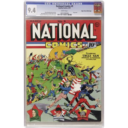 <B>National Comics #9 Mile High pedigree (Quality, 1941) CGC NM 9.4 White pages.</B></I> To simply call this a "flag cover" would be to underrate this red, white, and blue free-for-all! Lou Fine is the artist, Uncle Sam the character. This is the only copy graded above 9.0 by CGC to date. Overstreet 2006 NM- 9.2 value = $1,725. CGC census 3/07: 1 in 9.4, none higher.<BR><BR><b>Shipping:</b> Comics - Slabbed (certified) (<a target="_blank" href="http://www.heritageauctions.com/common/shipping.php">view shipping information</a>)