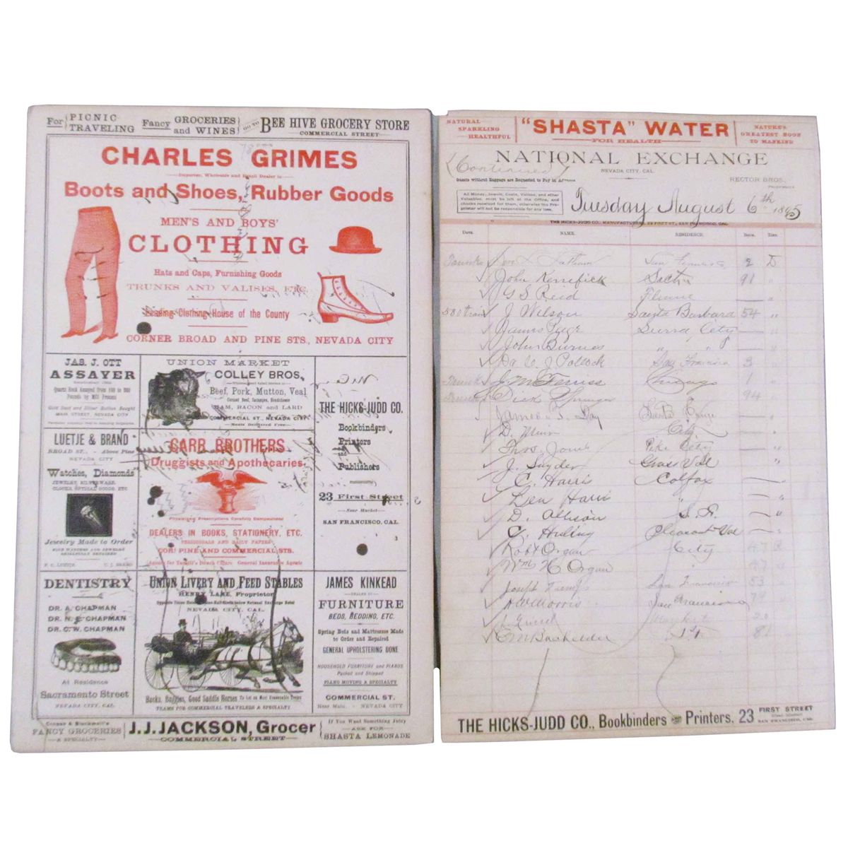 National Exchange Hotel, Nevada City, CA. Register Page for August 6, 1895. Bull Meeks signature on page. Produced by Hicks-Judd Co. Mfg. San Francisco book binders. Includes blotter page with advertisement. Excellent condition. 11 1/4 X 18 inches.