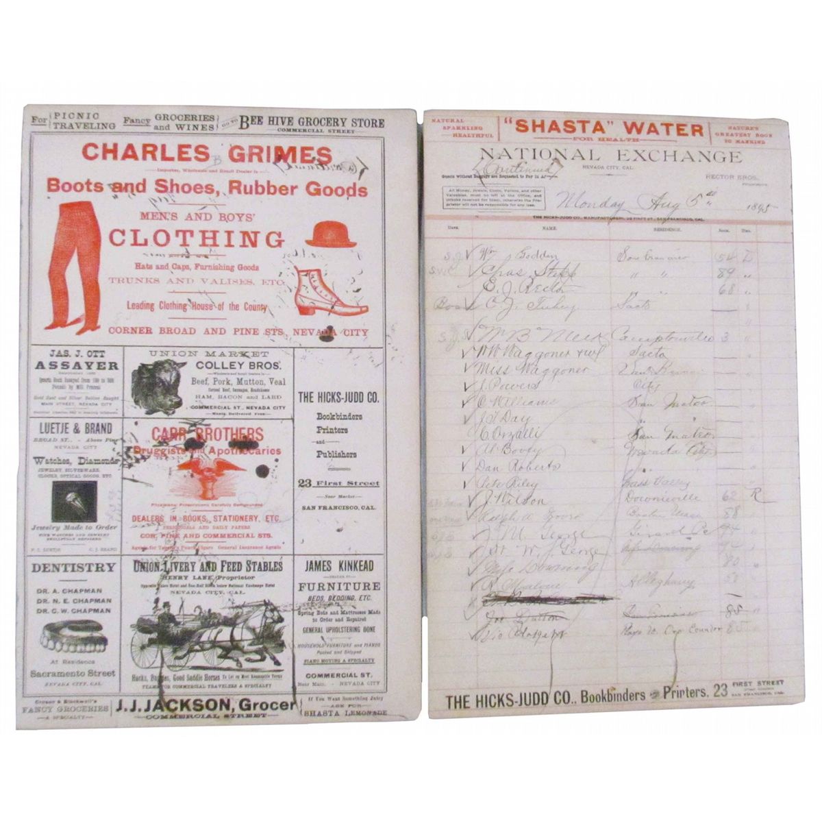 National Exchange Hotel, Nevada City, CA. Register Page for August 5, 1895. Wm. McKinley signature on page. Produced by Hicks-Judd Co. Mfg. San Francisco book binders. Includes blotter page with advertisement. Excellent condition. 11 1/4 X 18 inches.