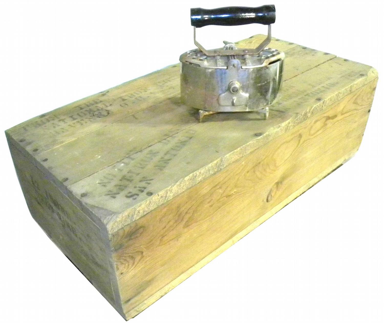 National Iron Company, San Antonio, TX. Original wood shipping crate containing 12 irons, never opened. Latest patent date. Oct 31, 1916. Comes with an iron to show contents of crate. 29 X 8 3/4 X 14 inches.