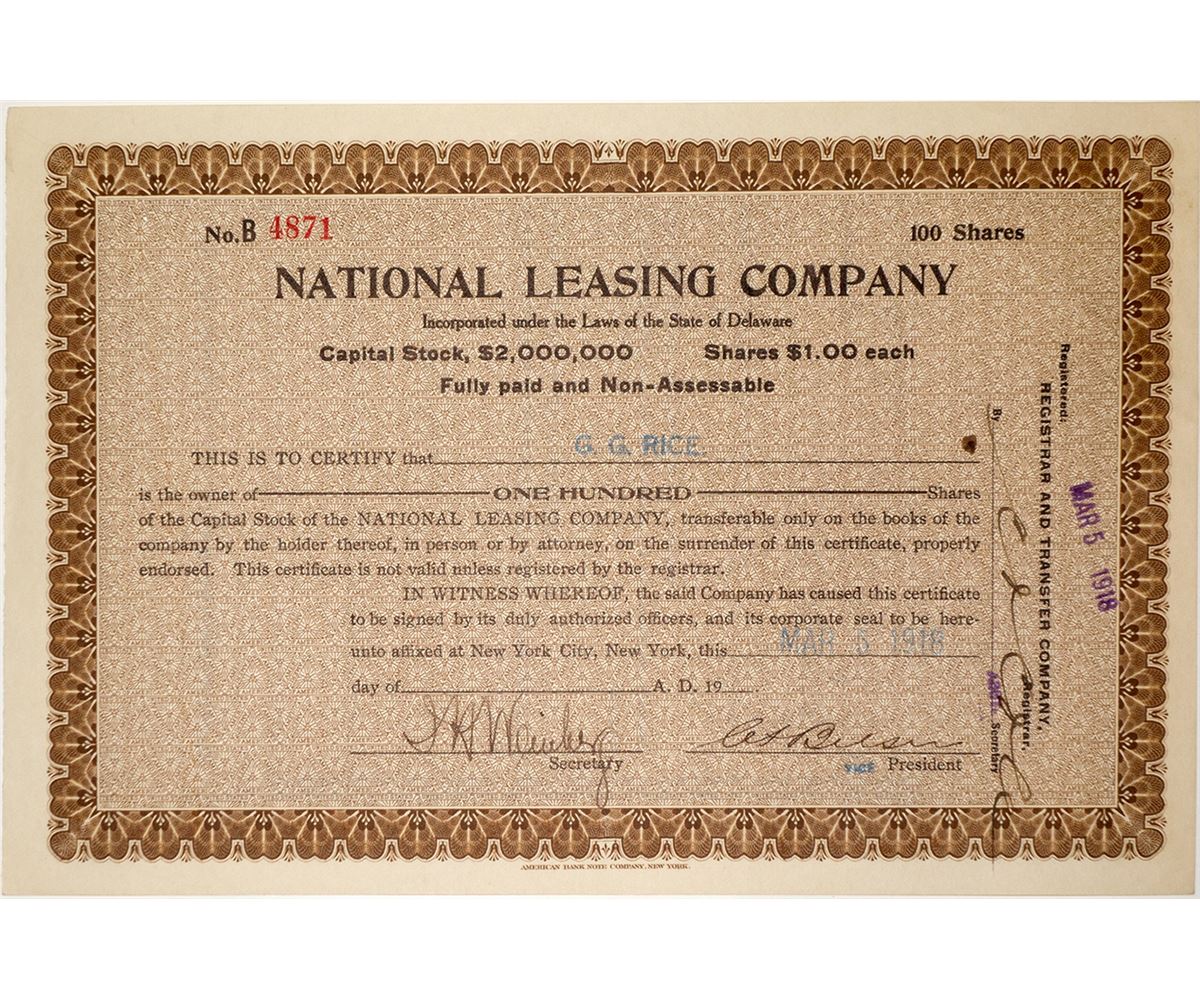 Uncancelled stock, no. 4871 issued to G. G. Rice, 100 shares, signed by G.G. Rice signature on reverse. Brown on crème paper. The townsite was about 60 miles north of Winnemucca. It was known as having the richest gold ore found in the state of Nevada at one time, as much as $30 per pound of ore. Initial discoveries were made in 1907 and by 1908, leases had been drawn up based on a sliding scale of royalty payments. By 1912, the town had a number of merchants including stores, saloons, a hotel, and a post office. That year, two men stole sacks of ore from a mine shaft, and the mine owners installed a searchlight and hired round-the-clock security. Later that year the mine owners brought suit against two neighboring mines for trespassing on the property. G.G. Rice was an infamous stock promoter who went to prison for his questionable trading practices. He wrote a book there titled Adventures with Your Money. He returned to stock trading after his release but the authorities were soon back on his trail.
