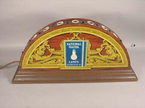 National Mazda lamp store display. Tin/wood/electric - includes all bulbs (not shown) Ex. cond. 28" x 13"