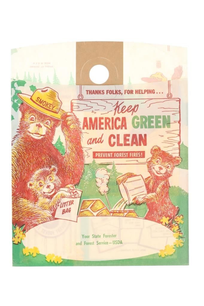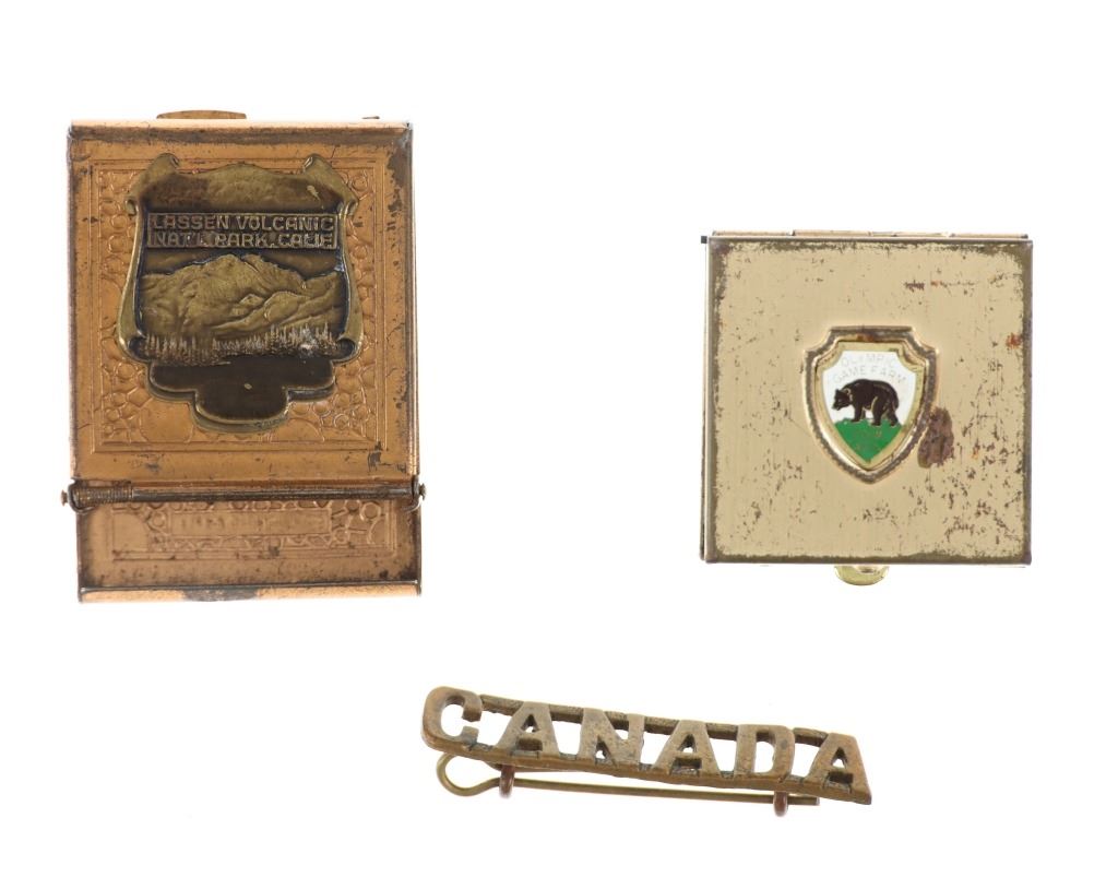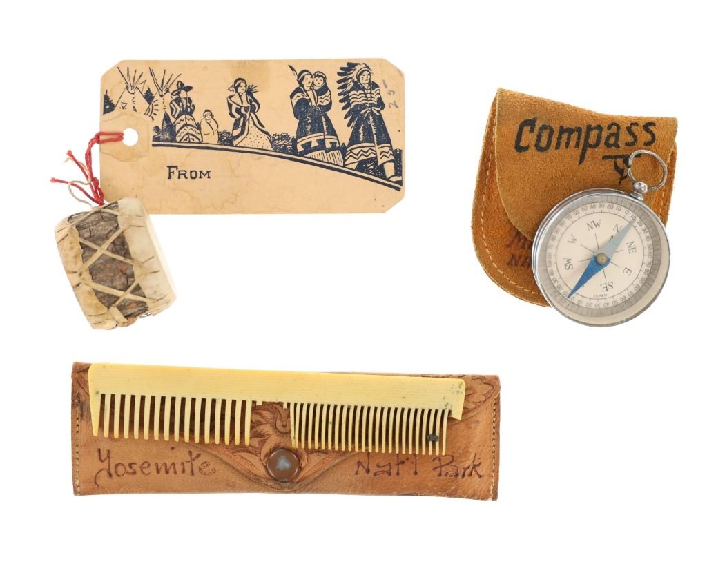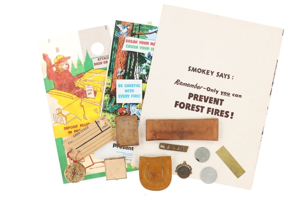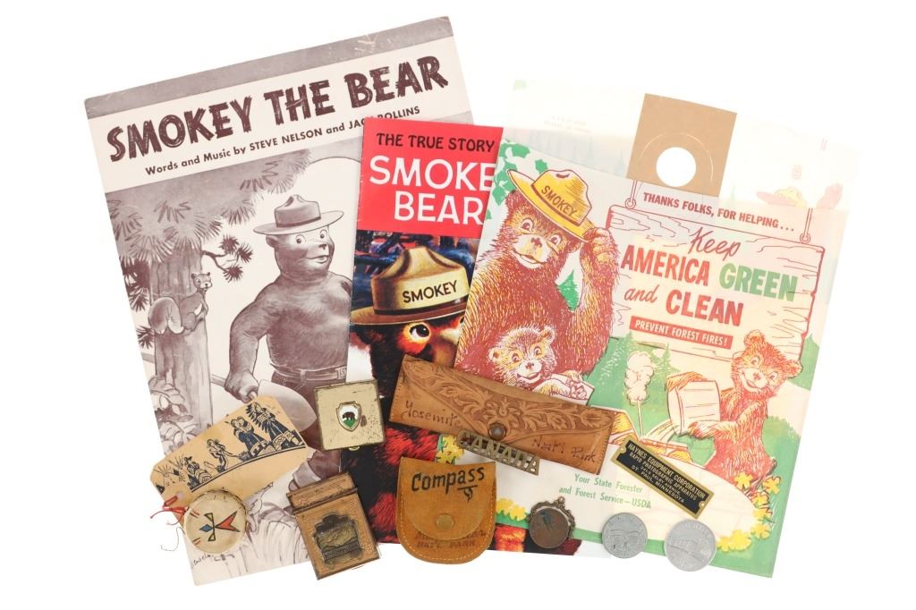For your consideration is this lot of National Park ephemera from various parks and locations circa 1915-1970s. This lot features thirteen items from various locations and National Parks including a trade post souvenir drum, a Mount Rushmore National Memorial coin, an original Yosemite National Park hair comb, a Lassen Volcanic National Park match holder, a Haynes Equipment Corporation metal tag, an Olympic Game Farm small metal box, a compass in a leather case from Mount Rainier National Park, a Canada pin, a "Sample of Aluminum used in the new Union Pacific Train" lucky coin, a spinning coin from Yellowstone National Park, a Smokey The Bear litter bag, a Smokey The Bear comic book titled, "The True Story of Smokey Bear" and a Smokey The Bear music book by Steve Nelson and Jack Rollins. The pieces show good condition overall with wear present to the items from their age and use over the years, but no signs of major damage is noted. The pieces measure from 12" L x 9" W to 1 1/8" L x 1 1/8" W. They have a collective weight of 6 ounces.