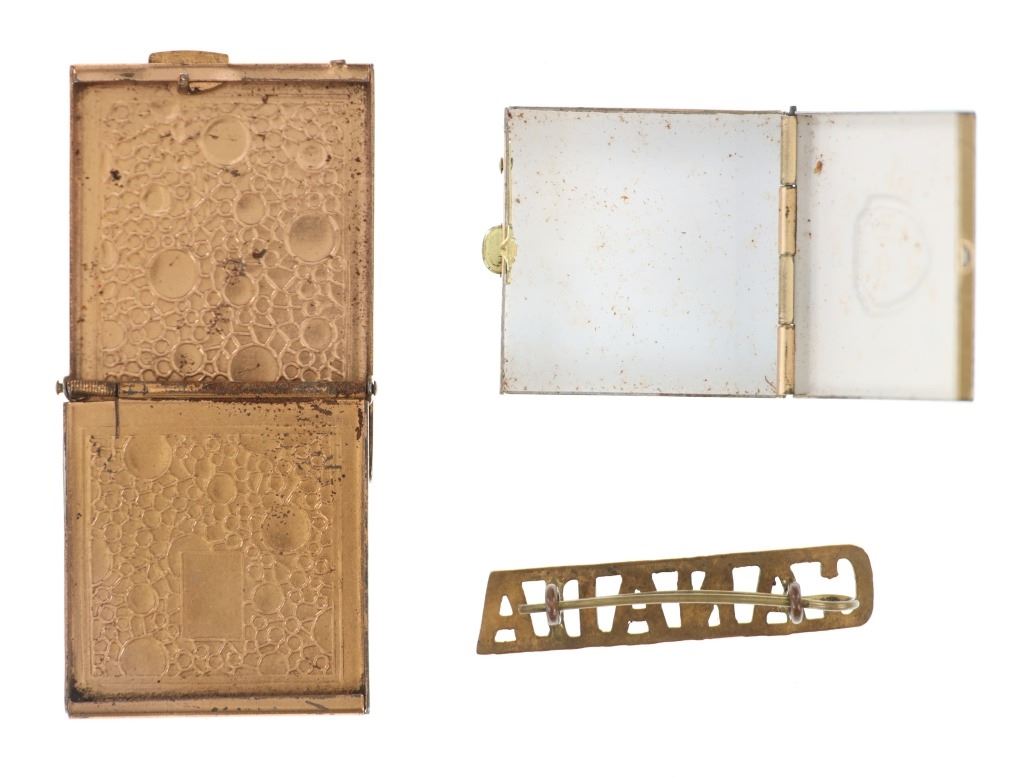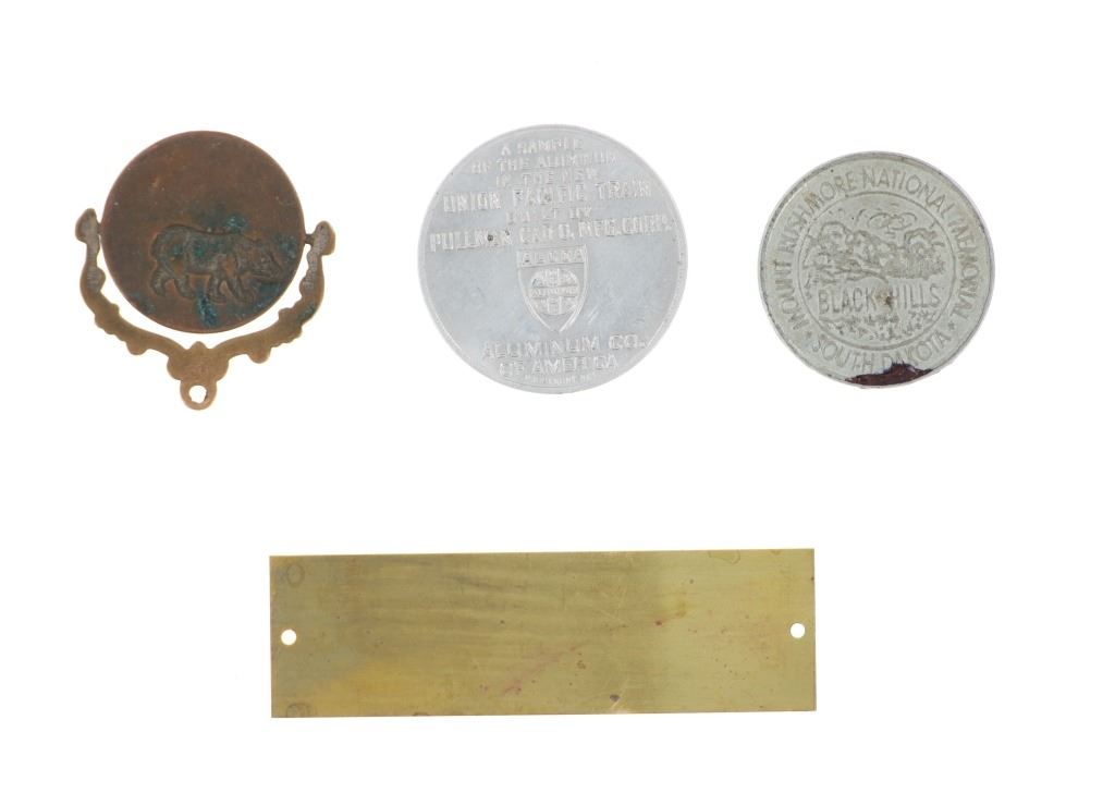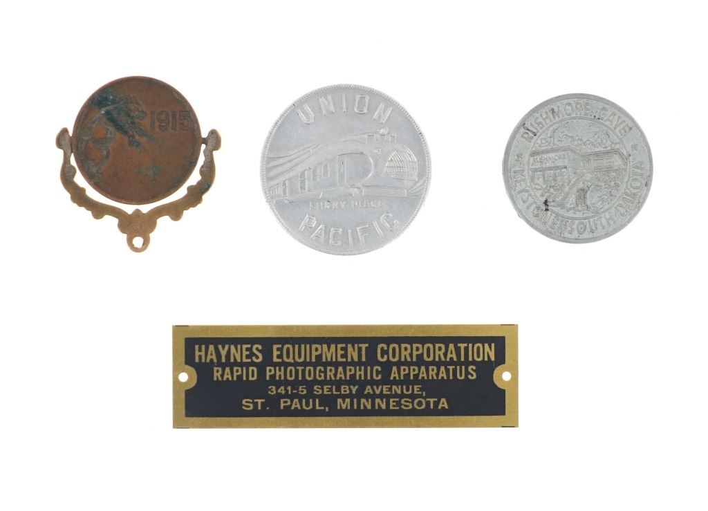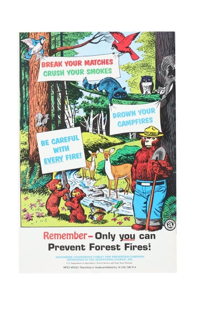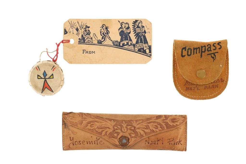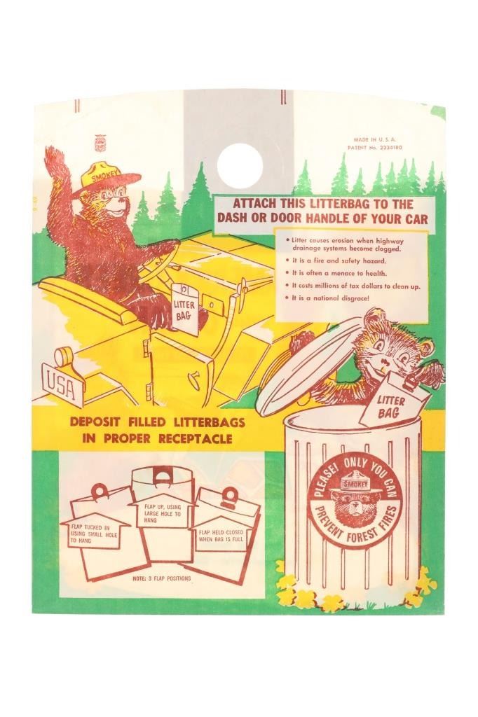 For your consideration is this lot of National Park ephemera from various parks and locations circa 1915-1970s. This lot features thirteen items from various locations and National Parks including a trade post souvenir drum, a Mount Rushmore National Memorial coin, an original Yosemite National Park hair comb, a Lassen Volcanic National Park match holder, a Haynes Equipment Corporation metal tag, an Olympic Game Farm small metal box, a compass in a leather case from Mount Rainier National Park, a Canada pin, a "Sample of Aluminum used in the new Union Pacific Train" lucky coin, a spinning coin from Yellowstone National Park, a Smokey The Bear litter bag, a Smokey The Bear comic book titled, "The True Story of Smokey Bear" and a Smokey The Bear music book by Steve Nelson and Jack Rollins. The pieces show good condition overall with wear present to the items from their age and use over the years, but no signs of major damage is noted. The pieces measure from 12" L x 9" W to 1 1/8" L x 1 1/8" W. They have a collective weight of 6 ounces.