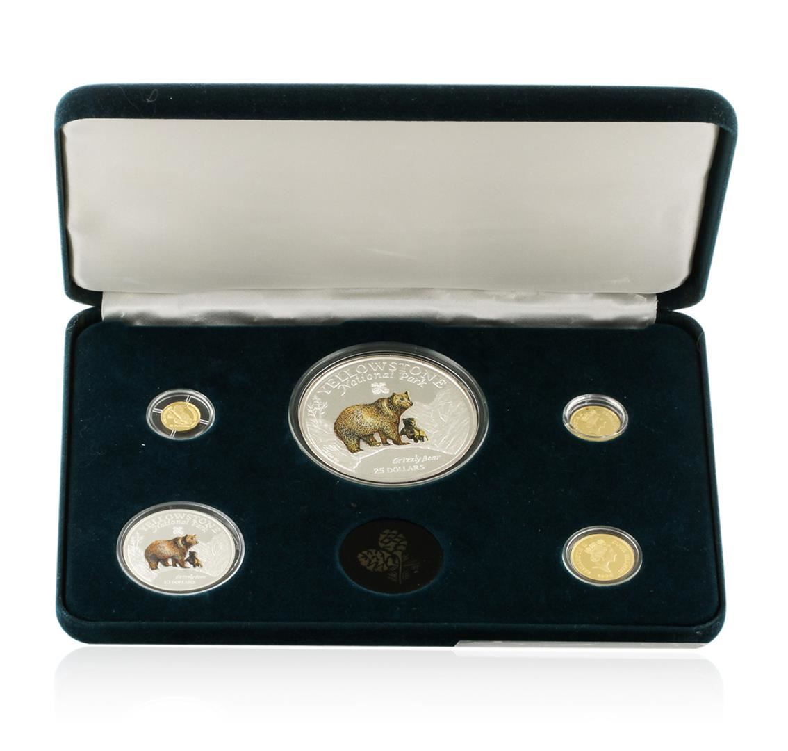 One National Park Foundation Wildlife Preservation Coin Collection. A colorful addition to your collection! This set includes a 1 ounce sterling silver colored Proof coin, a 5 ounce pure silver color Proof coin, and 1/25, 1/10 and 1/4 ounce pure gold Proof coins. The obverse of each Proof shows the exquisite frosted relief portrait of Queen Elizabeth II against a gleaming, flawless background. The reverse of each silver coin features Yellowstone's most notable residents, a Grizzly Bear with cub - in full color! The reverse of the gold coins shows a Grizzly Bear cub.