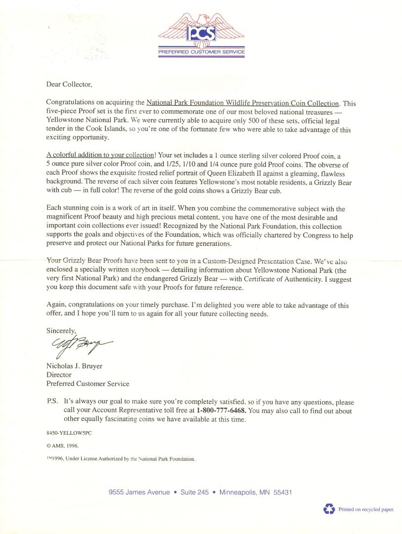 One National Park Foundation Wildlife Preservation Coin Collection. A colorful addition to your collection! This set includes a 1 ounce sterling silver colored Proof coin, a 5 ounce pure silver color Proof coin, and 1/25, 1/10 and 1/4 ounce pure gold Proof coins. The obverse of each Proof shows the exquisite frosted relief portrait of Queen Elizabeth II against a gleaming, flawless background. The reverse of each silver coin features Yellowstone's most notable residents, a Grizzly Bear with cub - in full color! The reverse of the gold coins shows a Grizzly Bear cub.