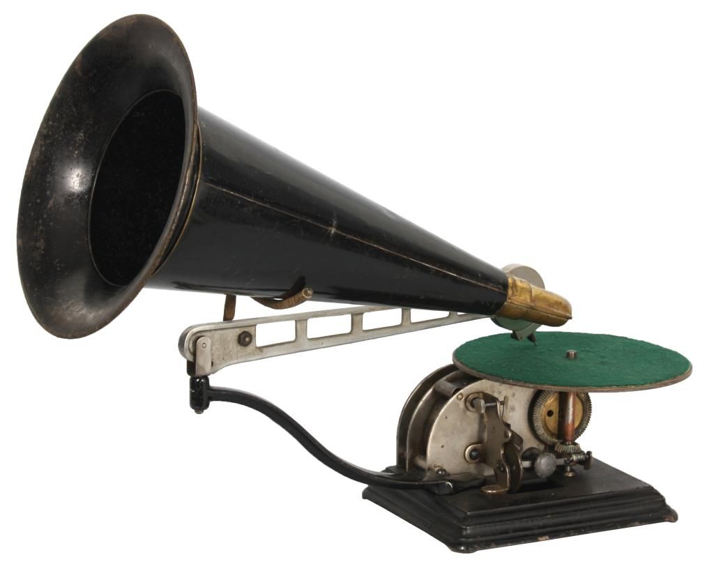 National Phono. Co. Disc Phonograph. The skelotonized phonograph has an iron base and side arm, painted black, pierced silver painted tone arm and brass horn fitting mounted to the receiver playing discs on a 7 in. turn table; spring driven mechanism has exposed steel plates and gears with crank on the side which is signed National Phono. Co. Orange, N.J. The metal horn has a flared bell and is 14 in. long x 8.5 in. dia. overall dimensions are 15 in. high x 20 in. wide x 7 in. deep.