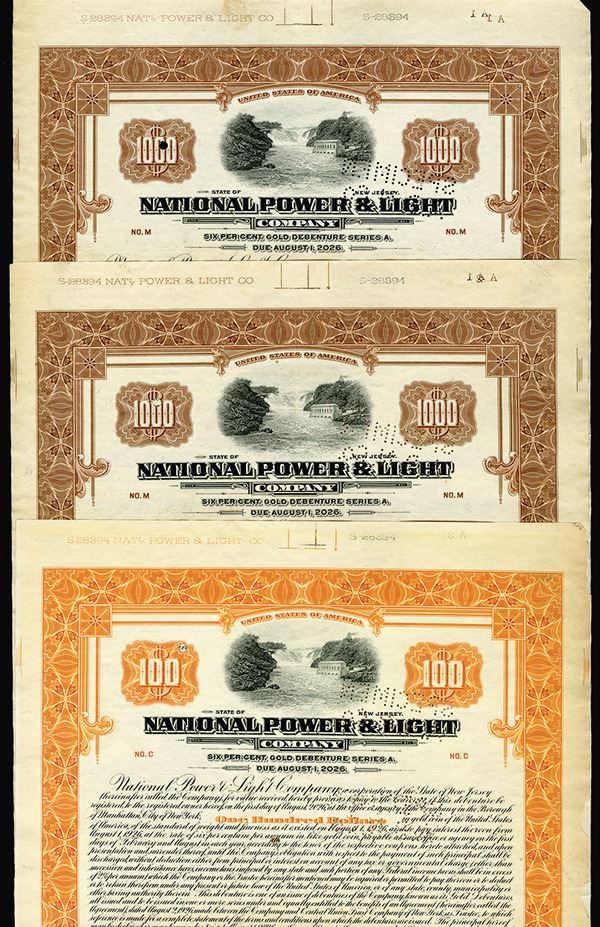 New Jersey, 1926, Includes 3 different bonds, $100 and $1000 (2), 6% Gold Bonds, no coupons attached, Pin punched specimen, Excess margin at top, All are in VF condition. ABNC.