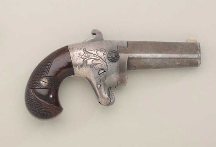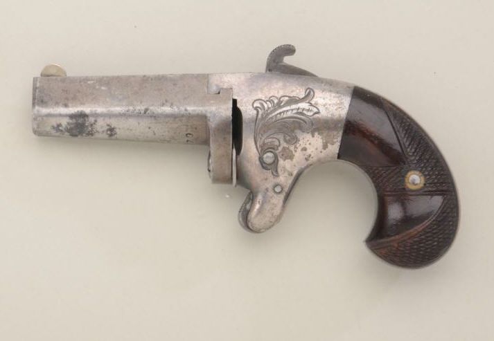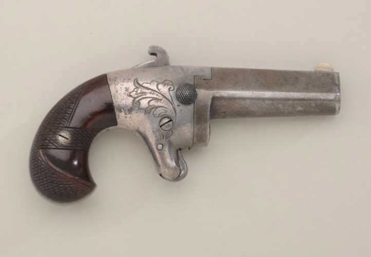 National Second Model style .41 cal. derringer in good condition, serial #10673. The derringer shows brown patina on barrel with some light to moderate erosion and pinprick pitting, good edges, good address.The frame shows 60-80% darkened original silver plate that is uncleaned. The grips are very good+ to near fine; the hammer shows traces of case hardening, the sheet metal extractor and original button release areretained. Colt bought National out in 1870, and these early derringers are scarce. Est.: $800-$1,600