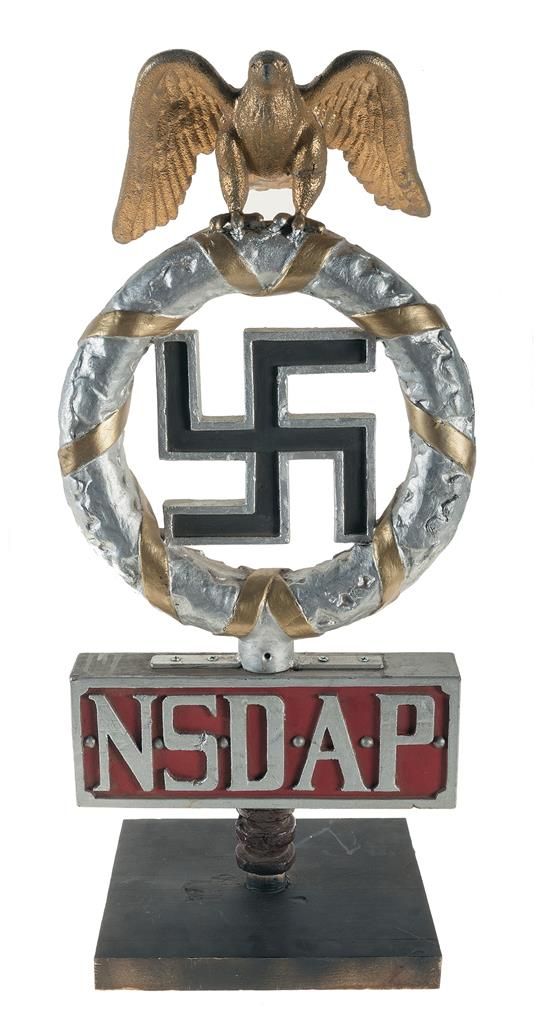 Measuring 16" wide and 35 1/2" tall, painted wood construction with a gold eagle over a silver and black wreathed swastika, with a red and silver "*N*S*D*A*P*" panel. Reportedly used in a wartime propaganda film, though the production and nation of origin are unknown. Fair, with some cracking and dents.