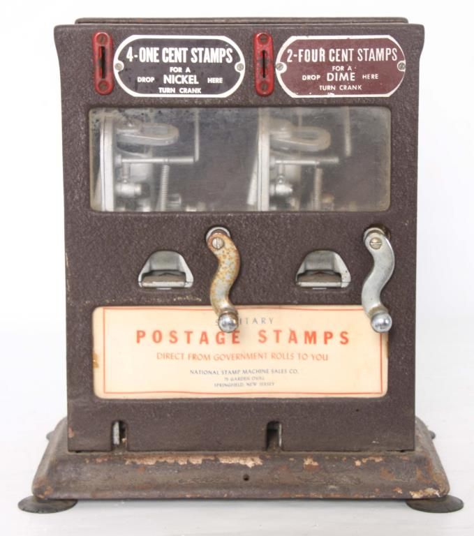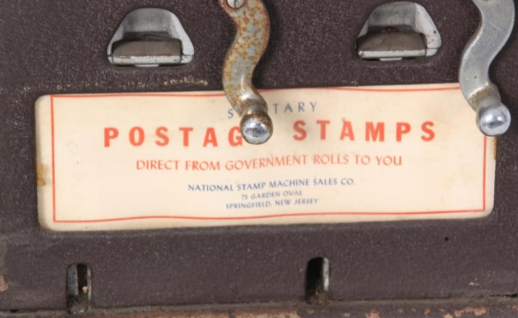 National Stamp Vending Machine. Machine has an iron front, back & base with white plastic side and top covers; the metal tags on the front, beside each coin slot, read “4 – One cent stamps for a nickel” & “2 – Four cent stamps for a dime”; has a viewing glass in the front of the machine showing the internal mechanism, with levers and stamp slots below. Paper insert in the front of the case reads “Sanitary Postage Stamps, Direct From Government Rolls To You. National Stamp Machine Sales Co.” 13 in. high x 12 in. wide x 8 in. deep.