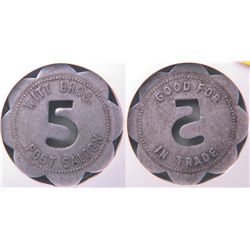 Witt Bros. / Post Saloon // GF 5c IT. The '5" is cut out of the token. According to the Texas token book this token is also attributed to P...
