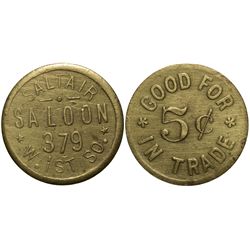 Obverse: Saltair Saloon / 379 W. 1st / So.; reverse: Good For / 5c / In Trade. Al, 21mm, R9. Extremely fine condition. City: Salt Lake Ci