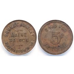 Rare West Virginia token. Maine Saloon / Ernest Hanley / Huntington, W. Va. // GF 5c IT. Genuine. City: Huntington County: