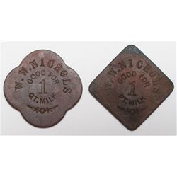 Lot of 2. 1) W.W. Nichols/GOOD FOR ONE PINT MILK/Square brass 23 mm. Incused, rare. 2) W.W. Nichols/GOOD FOR ONE QUART MILK/Brass 23mm scalloped.