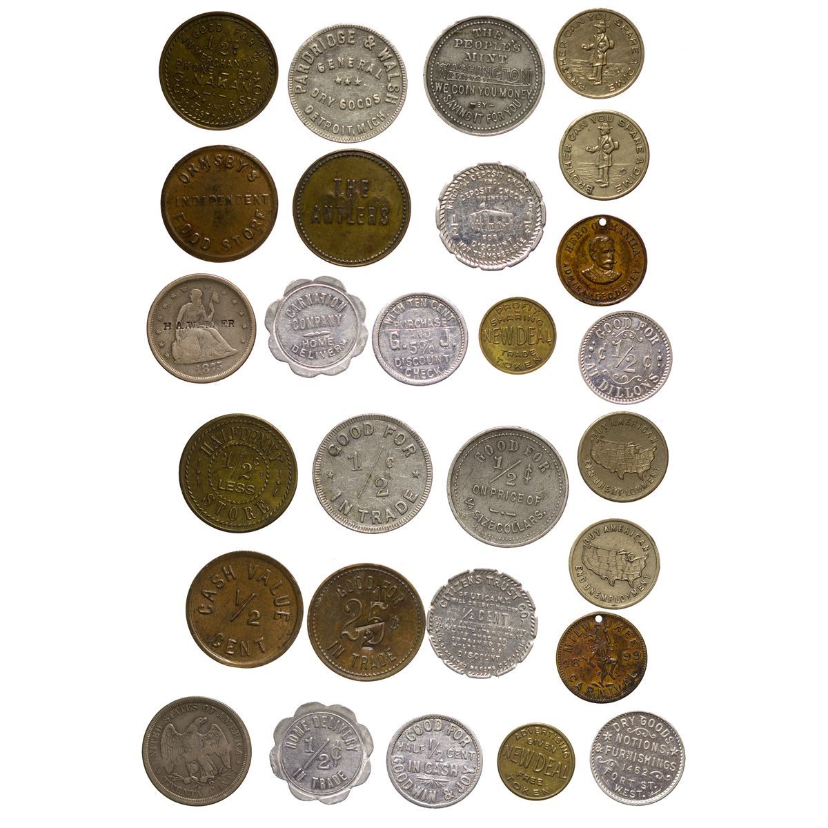 Lot of 14 Depression Era and US city tokens, dating from 1875 to 1936, including denominations of 1/2 cent through 20 cents. Multiple metal compositions. - Weber Collection